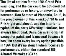 For the more performance-minded, there was some good news and bad news. First the bad news: Following GM's pullout from racing in January 1963, the 421 Super Duty engines were dropped for good. While this loss affected racers of Pontiac Catalinas more than Grand Prixs (only 19 SD Grand Prixs were built in 1962-63), it signaled the beginning of Chrysler dominance in racing.